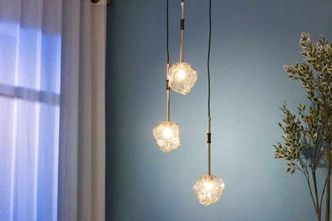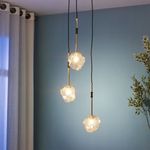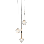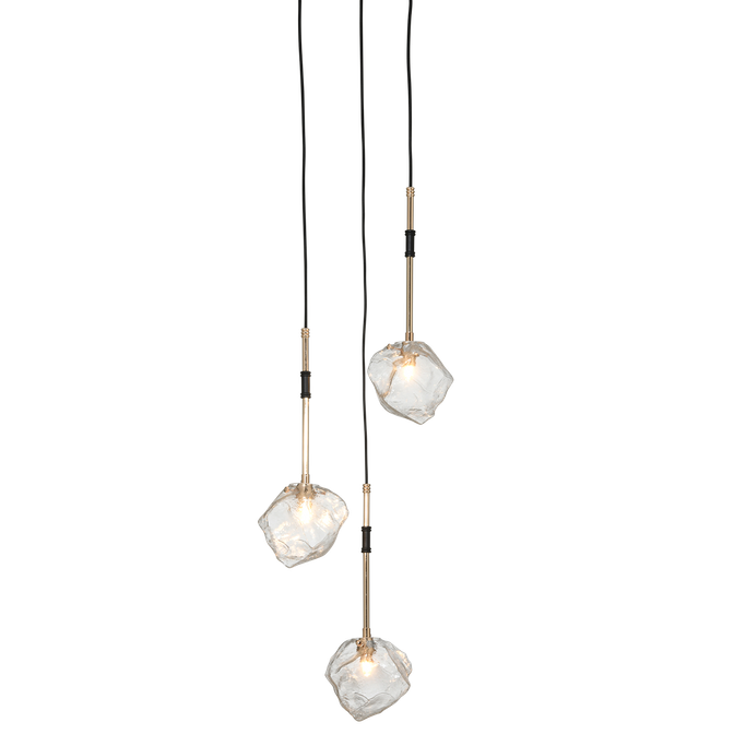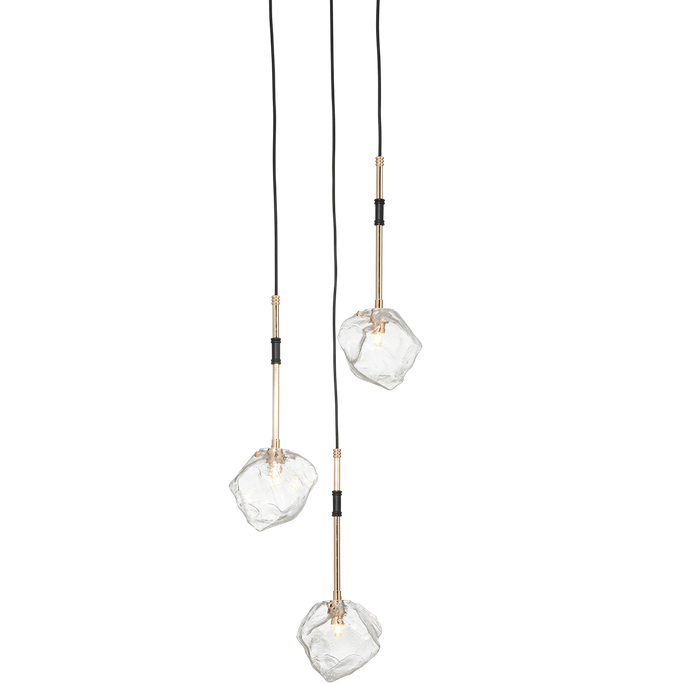 Renew your space with the Meteorite Ceiling Light. Designed with three irregularly shaped glass pieces hanging at varying lengths from elegant poles. It is made from metal and glass in black and gold colors. Enhance your ceiling with eye-catching radiance.