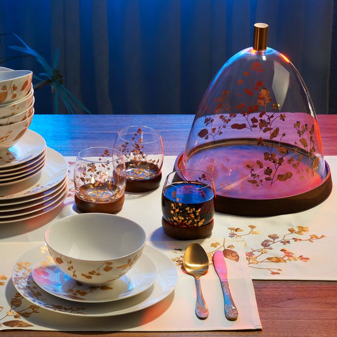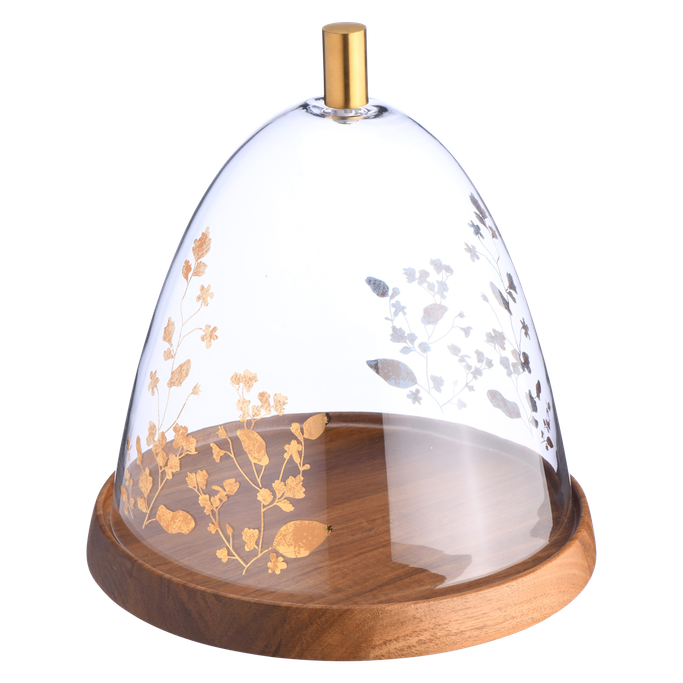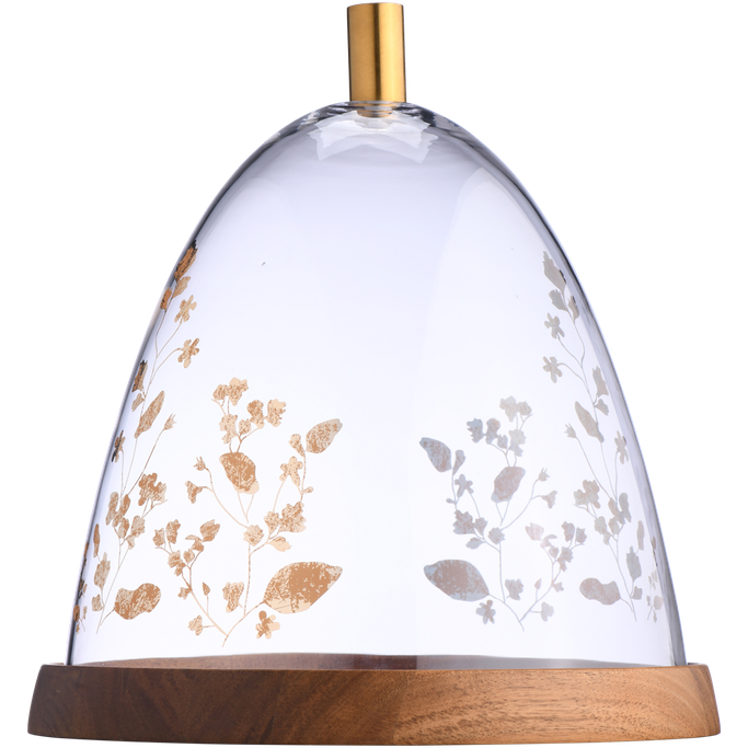 Botanical dream. The Leaves Cake Stand infuses nature's harmony in your home. With its floral prints and rustic touch, this piece takes you to a mesmerizing botanical oasis. The design offers a touch of golden hues to reflect elegance in your room. Made of fine glass with a wooden base, combining rustic and modern style in your home. Spruce up your gatherings and add life to your space all year long.