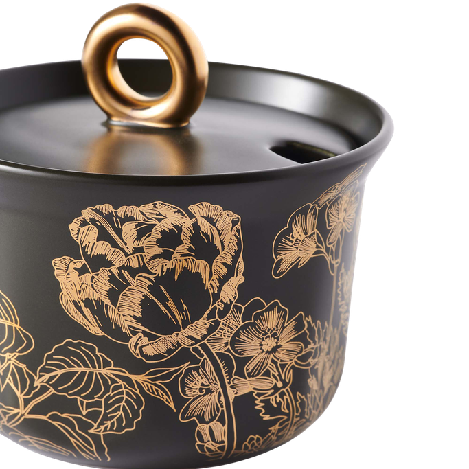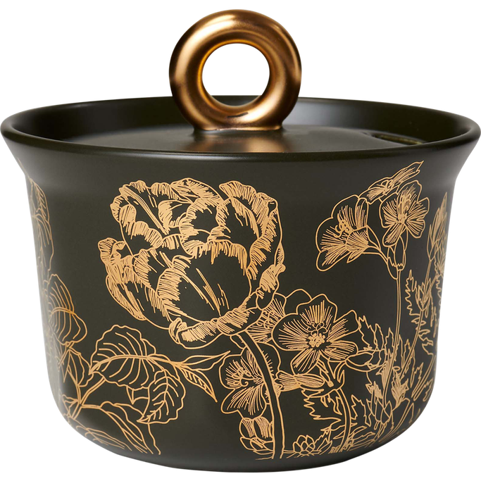 Sultana. The great Masterpiece Sugar Bowl will refine the ultimate grace around your table. The design acquired an outstanding décoration vogue. Use it as a luxuries sugar bowl or for your favorite nuts, dates, or even sweets. It is handmade porcelain in dark green color. It comes in a golden handle on the cover, and floral lines, for visual pleasure. Create wonderful times around your tea gathering.