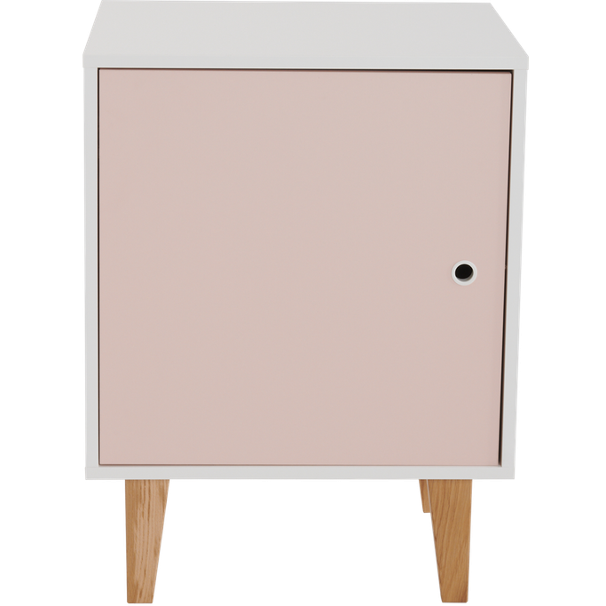 The place for treasures. Let the beautiful Concept Nightstand match your uniqueness and hold your favorite items like a treasure chest. The design will be your companion that evolves and blooms as you do. Have a perfect platform to display and express interests with the wide top. The high oak legs will leave a one-of-a-kind appeal in your space. It is made with white melamine and a pink-colored door. Have a stunning decorative journey with a variety of color options for this piece. Complete the bedroom with a unique touch.