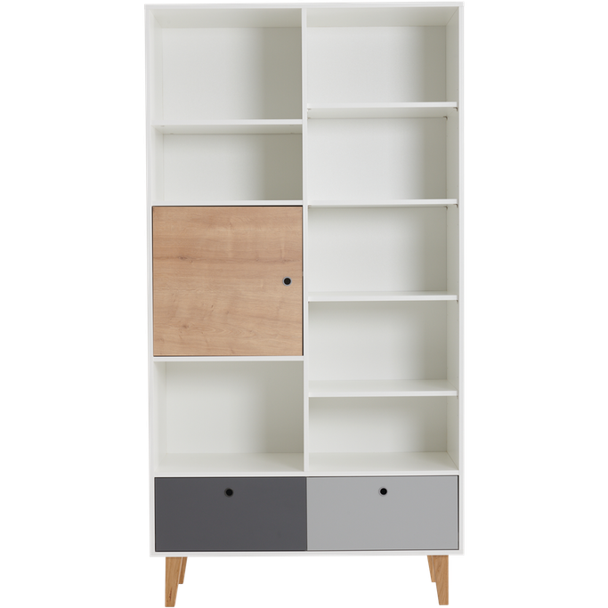 Artistic Story. Let the beautiful Concept Bookcase drive you through a journey of creativeness. Start your incredible story filled with art and colors. Display your favorite treasures and unique ornaments on the stylish shelves. Highlight the elegance of your room style with its asymmetrical design. The different drawer sizes offer excellent storage space for your decorative pieces. Its oak legs will provide a touch of elegance to your room. Its made of melamine with white,grey and oak colors to highlight the appearance of your interior. Complete your room look with a sophisticated touch.