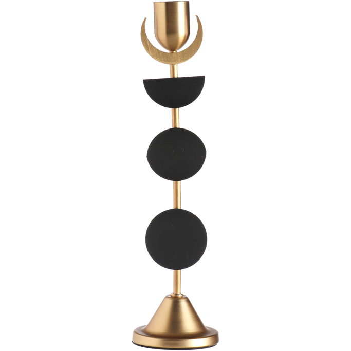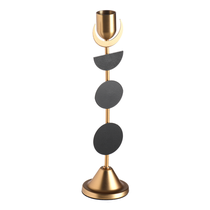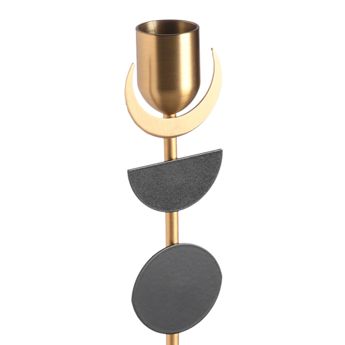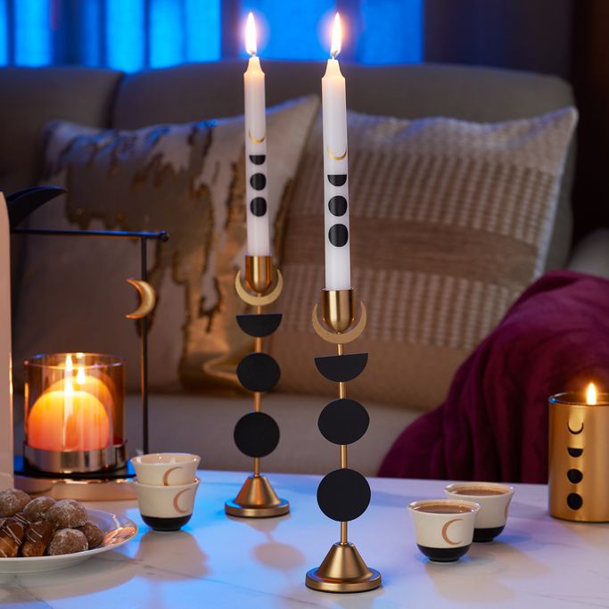 Renew the Energy. Invite the moon phases to enhance your decor with Ghasaq Candle Holder. Its majestic structure creates a sense of freshness in your surroundings. Inspired by the moon's rhythm to revitalize your aura. Created to show off all the beauty of your candles and let them shine like the moon. It's made of iron with golden and black shades to highlight the grandeur of your interior. Let your space be a sky of brightness.