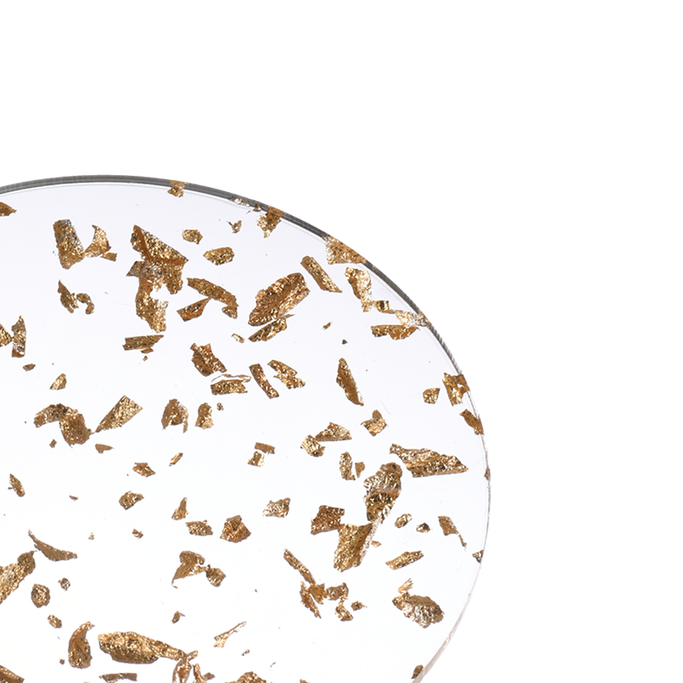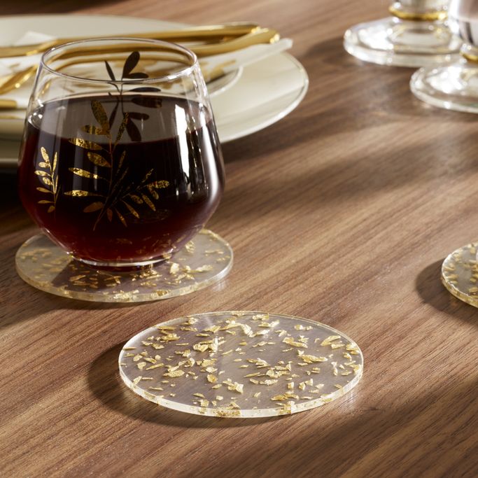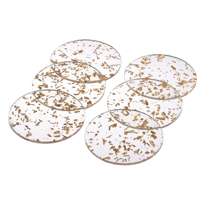 Among the Shimmering Ambiance. Your cup will shine brightly with Hayley Coaster Set. Your space will be glammed up to feel radiant bliss from every piece. The pattern exhibits a luscious beauty of golden hues that captivates all who view it. Designed to protect your table from heat and decorate your cups. It is made of clear acrylic with golden color to make your home glisten. Enjoy a drink amid opulence.