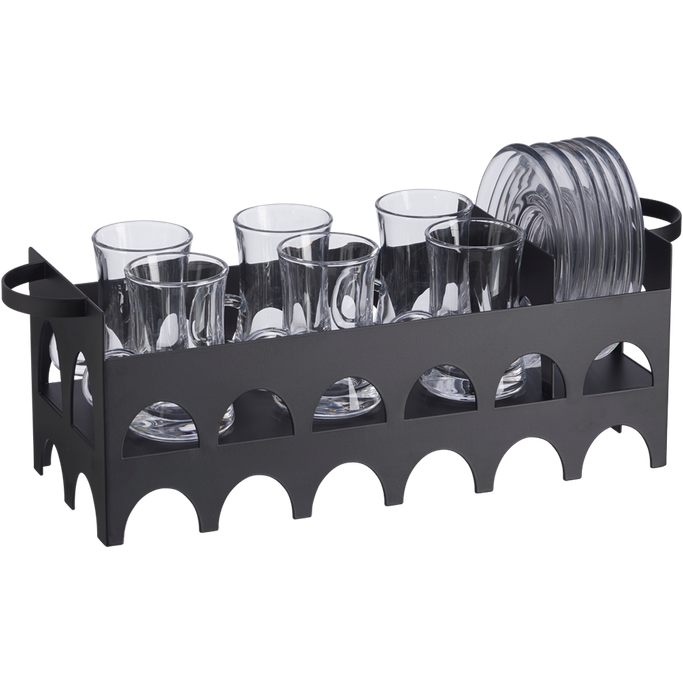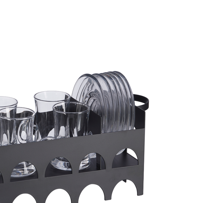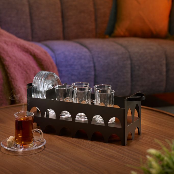 Like a Time Train. Capture the moments when the rhythm of elegance flows across your table with the Malika Tea Cup Set with Stand. Enjoy creating priceless memories of this piece in your home. Designed with a stand and handles that are easy to move with elegant tea cups and plates. It is made of clear glass and black metal with a semi-circular hollow that adds an authentic appearance. Appreciate valuable time with your guests.