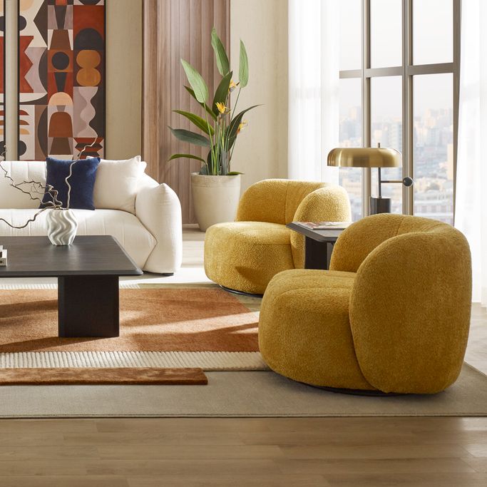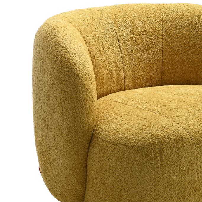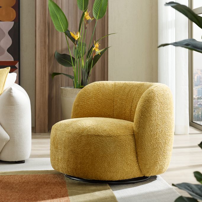 Embody the essence of beauty with the Sofia Single Chair, designed with rounded edges, a backrest, and armrests, along with a swivel base for easy movement. Crafted from pine wood and upholstered in fabric, it adds a touch of distinction to your home.