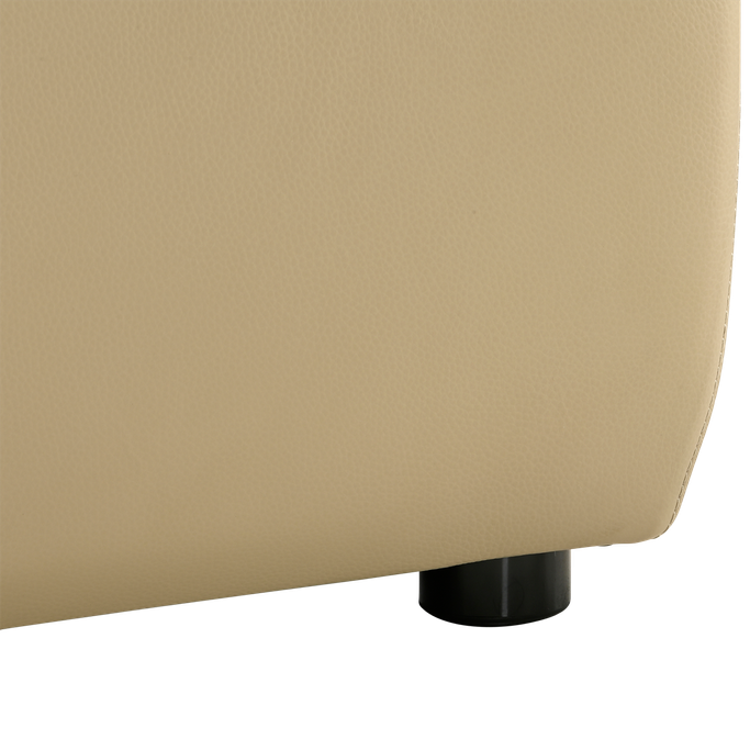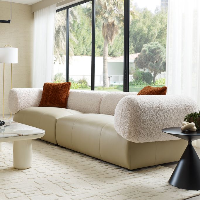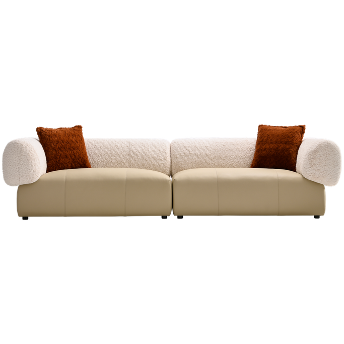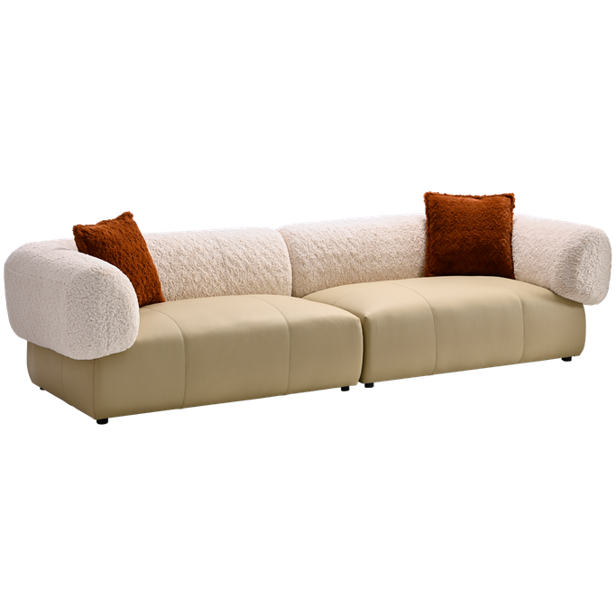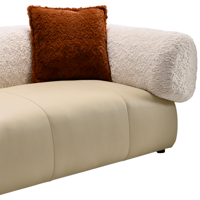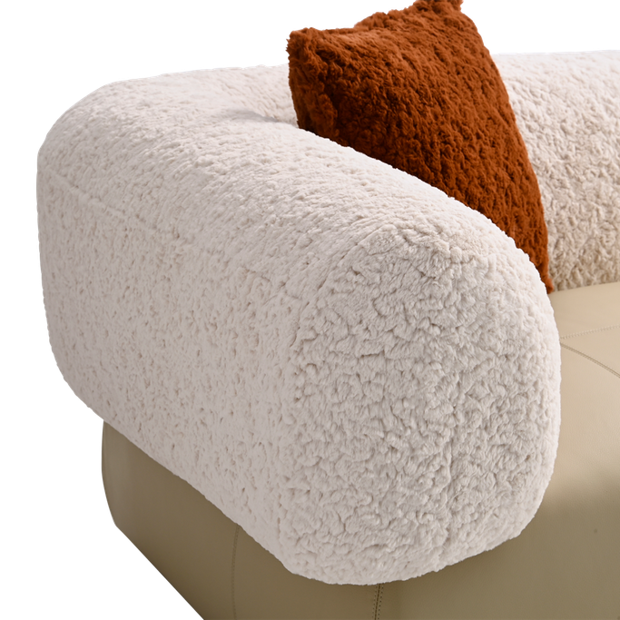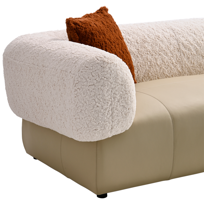 Elevate your space with the Alessia Sofa. Designed with a sleek rectangular base upholstered and wide, rounded arms elegance. Made from a sturdy wood and metal frame combines the genuine leather and fleece fabric in beige color with high-density foam padding for an exceptional seating experience.