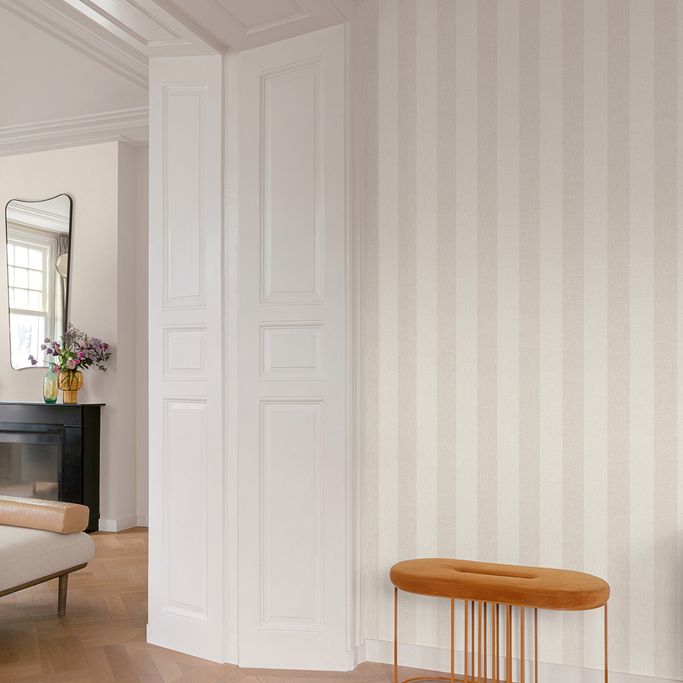 Enjoy elegance and calm with Atmosphere Wallpaper. It is made from vinyl plastic and non-woven fabric in an off-white color, featuring vertical stripes that add a harmonious aesthetic touch. Give your walls a modern look that blends seamlessly with decor elements.