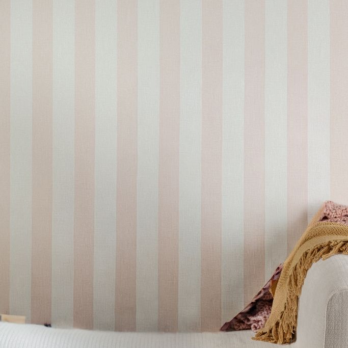 Enjoy elegance and calm with Atmosphere Wallpaper. It is made from vinyl plastic and non-woven fabric in a Light Pink color, featuring vertical stripes that add a harmonious aesthetic touch. Give your walls a modern look that blends seamlessly with decor elements.