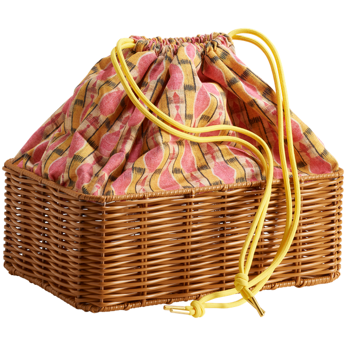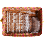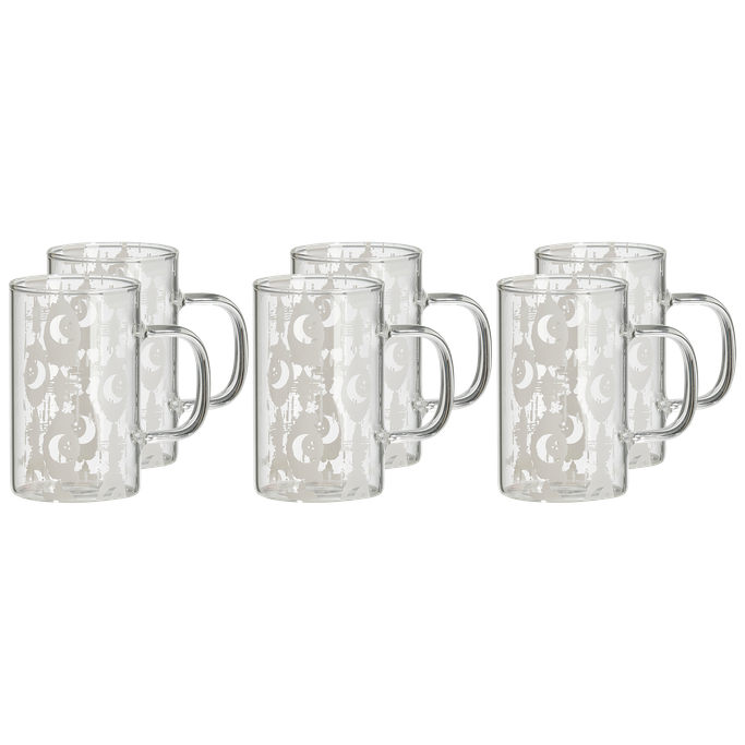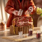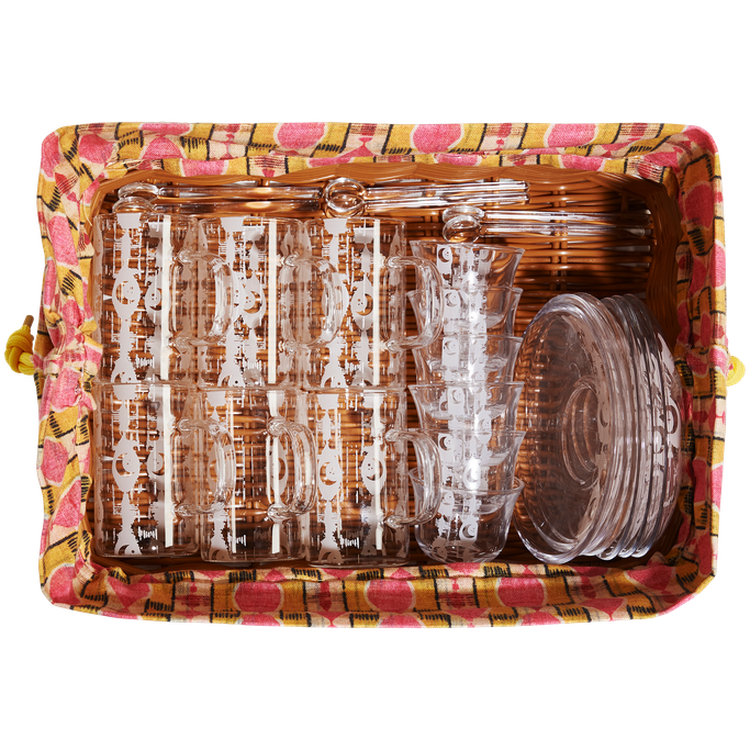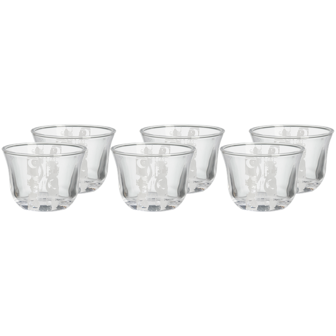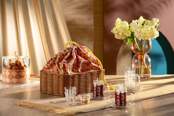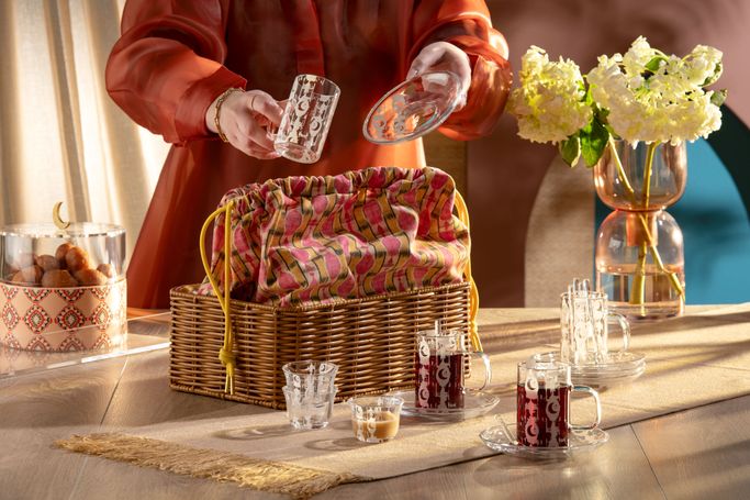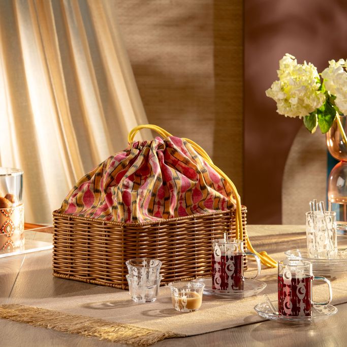 Celebrate warm Ramadan nights with Ziana Ramadan Set. Designed as nineteen pieces including Arabic coffee cups, tea cups, serving saucers, and small spoons, adorned with delicate Ramadan patterns, along with a woven basket featuring a patterned fabric lining with vibrant motifs and a drawstring closure to store and transport contents safely and elegantly. The set is made from Clear Glass and the basket from Fabric in a Browncolor. Give it as a perfect gift to your loved ones.
