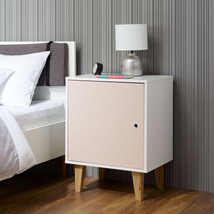 The place for treasures. Let the beautiful Concept Nightstand match your uniqueness and hold your favorite items like a treasure chest. The design will be your companion that evolves and blooms as you do. Have a perfect platform to display and express interests with the wide top. The high oak legs will leave a one-of-a-kind appeal in your space. It is made with white melamine and a pink-colored door. Have a stunning decorative journey with a variety of color options for this piece. Complete the bedroom with a unique touch.