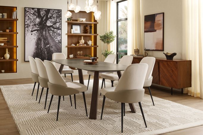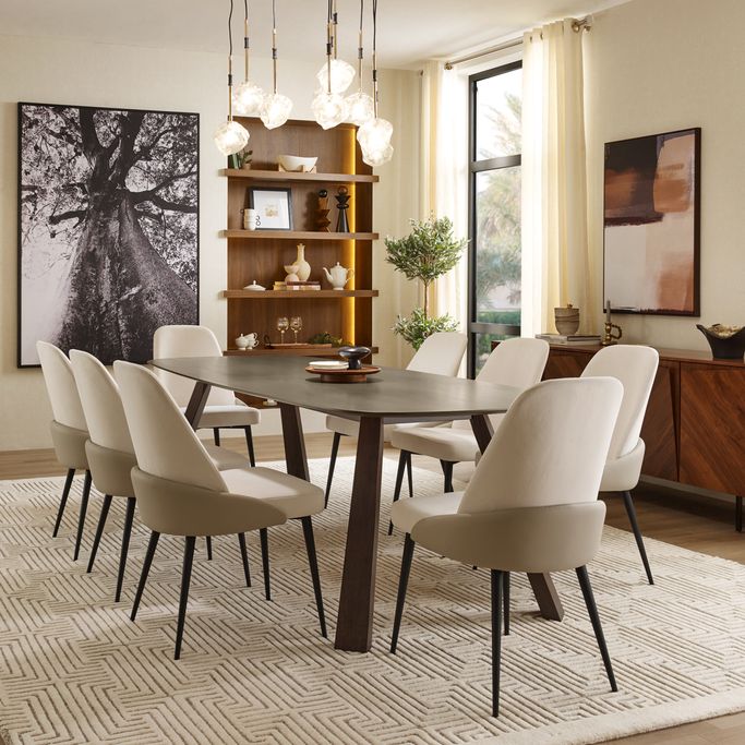 Make every dining gathering inspired with the Grove 8-Seat Dining Table. Designed with a rectangular top featuring curved edges and parallel cuts, supported by elegant angled legs. It is made from MDF and ash veneer quarter cut in a walnut color. Enjoy your new dining table with your loved ones.