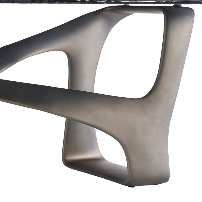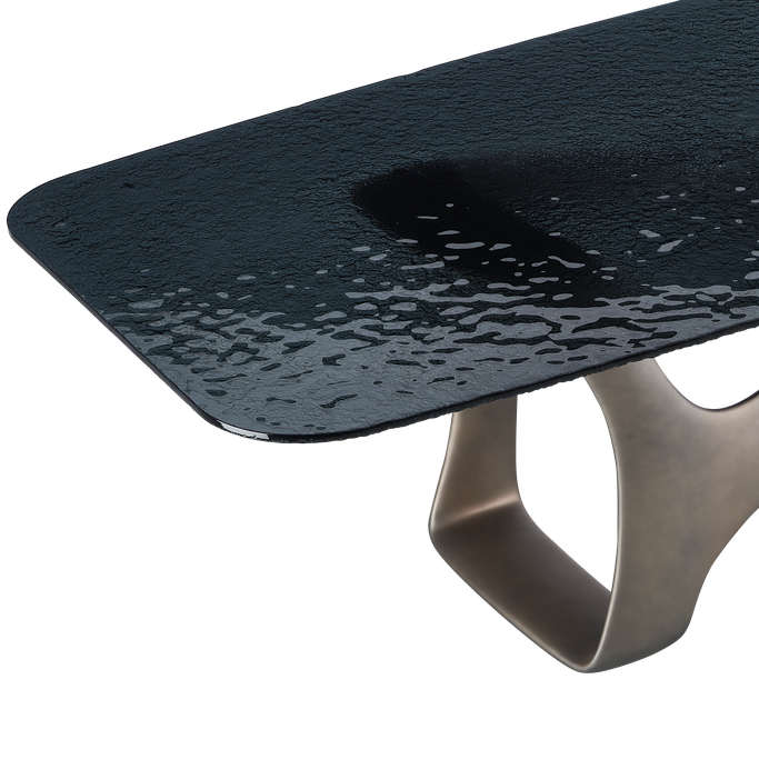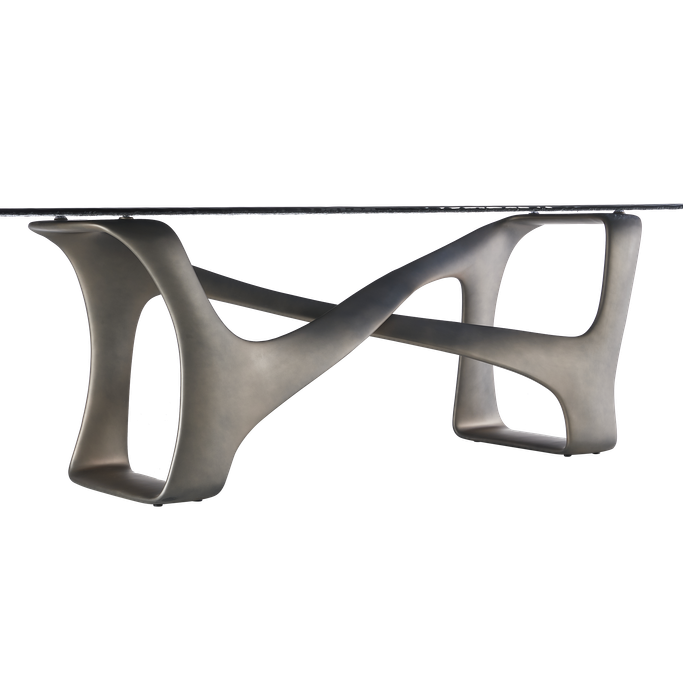Host the finest occasions with the captivating elegance of the Ripple Dining Table. Designed with a sleek surface that accommodates ten people, and a flowing base with intertwined curves that evoke a sense of motion and beauty. It is made from glass and fiberglass in a gray color. Add a new dimension of sophistication to every moment.