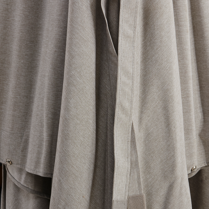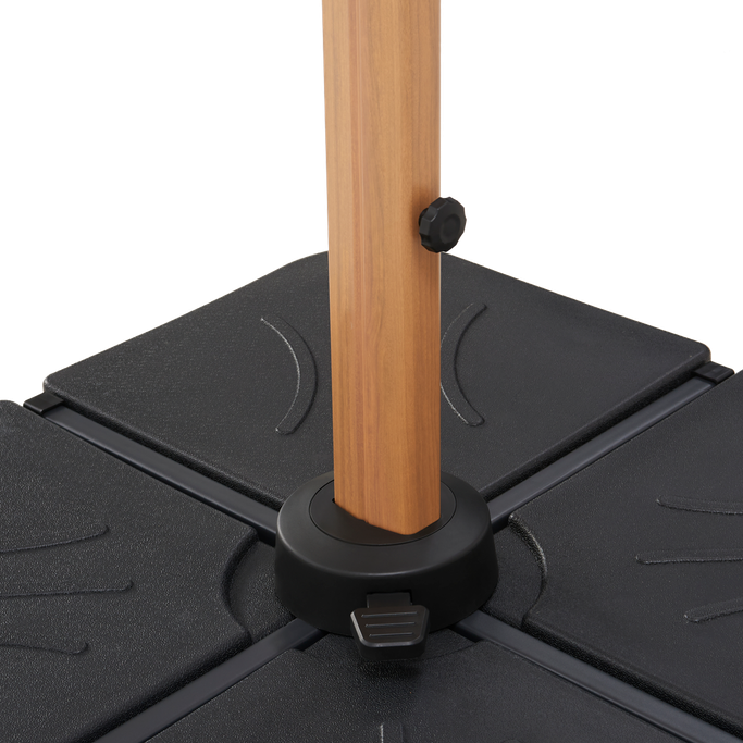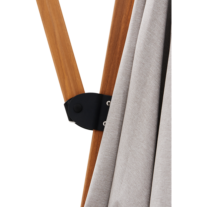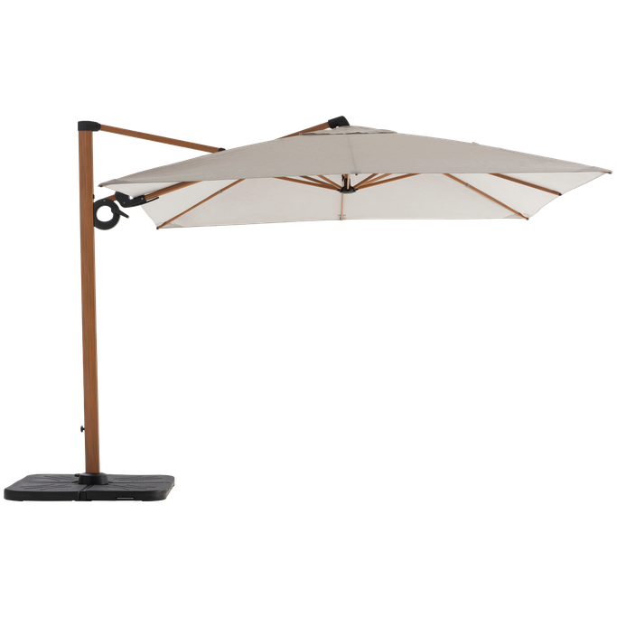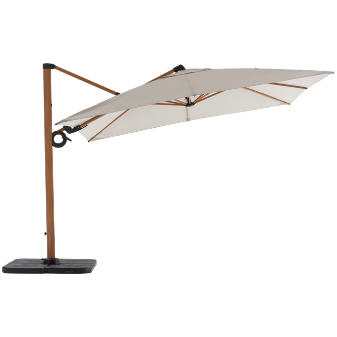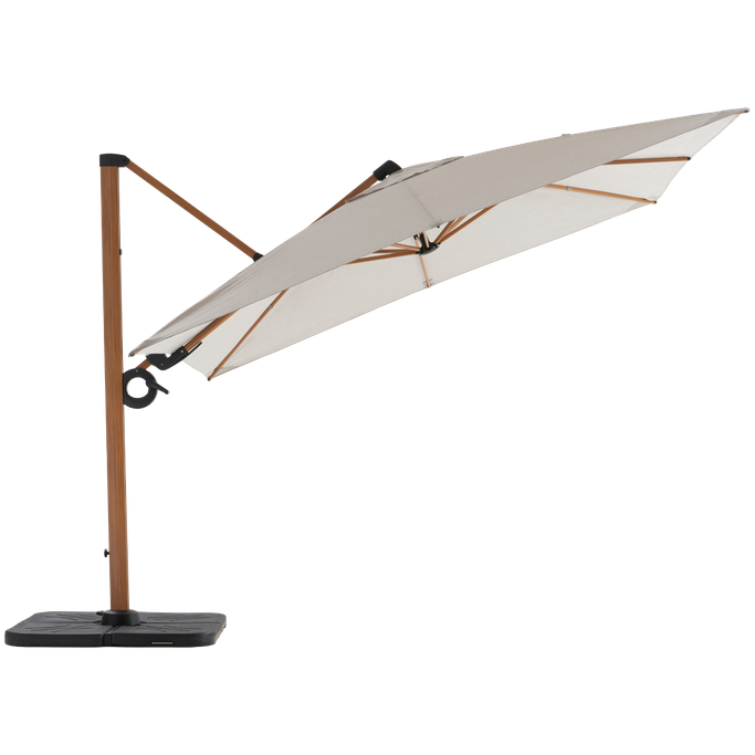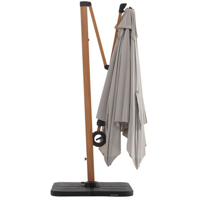 Shadows in harmony with your desires. Enjoy peaceful outdoor moments with the Plateau Umbrella. Designed with a sturdy metal frame supporting a large square canopy, it features a double-tilt mechanism, 360-degree swivel, and adjustable height to direct the shade precisely. It is made from aluminum with a wood-like finish and durable grey fabric. Turn your patio into a haven of comfort.