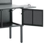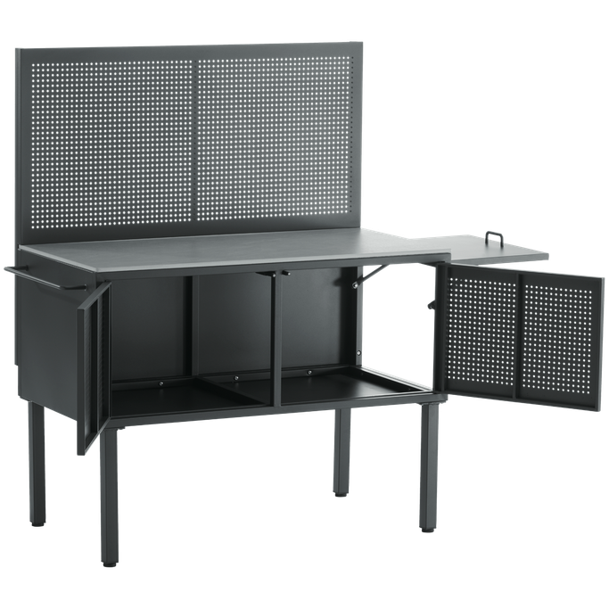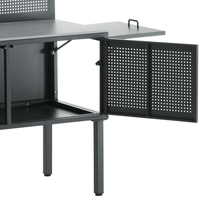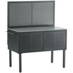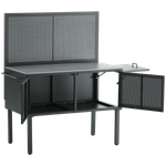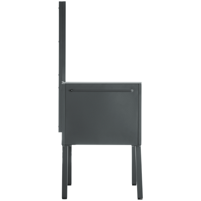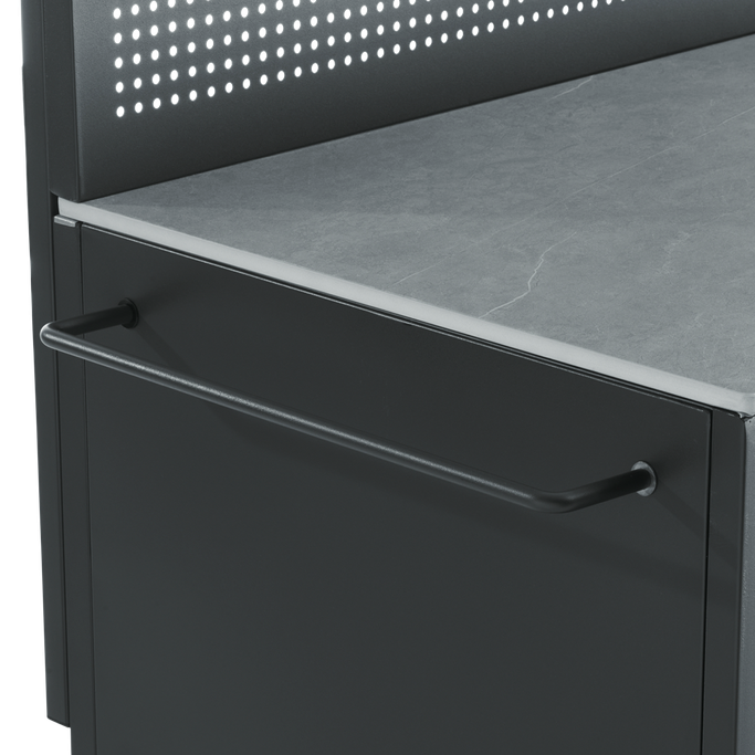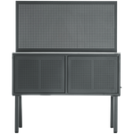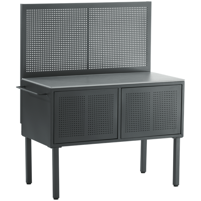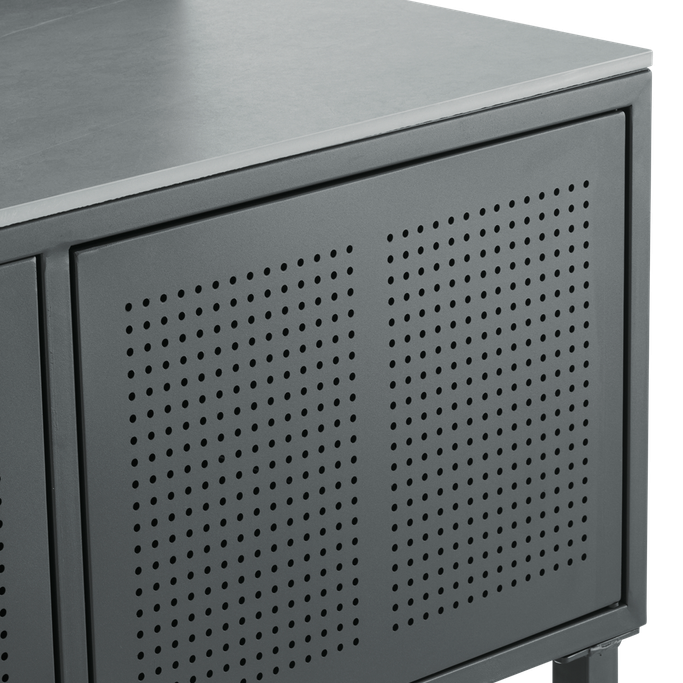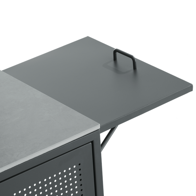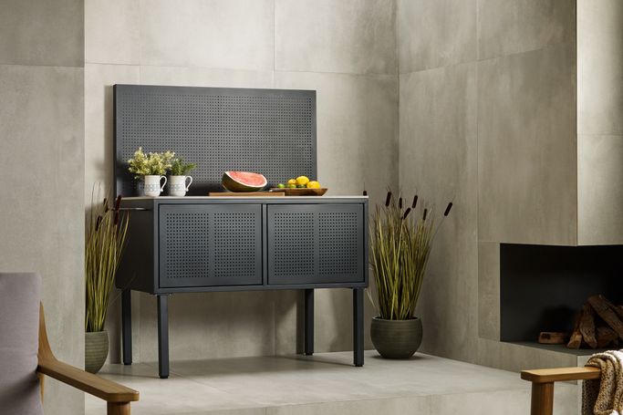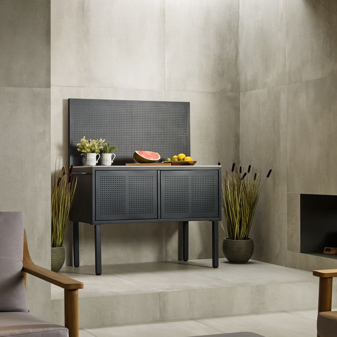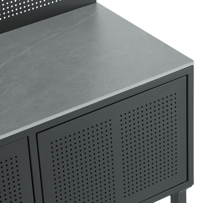 Add a new dimension to your outdoor gatherings with the Fiesta Serving Buffet. Designed with a rectangular top, an interior cabinet featuring perforated doors for ventilation and efficient storage, along with a raised back panel and a side handle for easy tool hanging. It is made from sturdy black steel with a tiled top surface that enhances its modern look. Elevate your garden with this functional and stylish addition.
