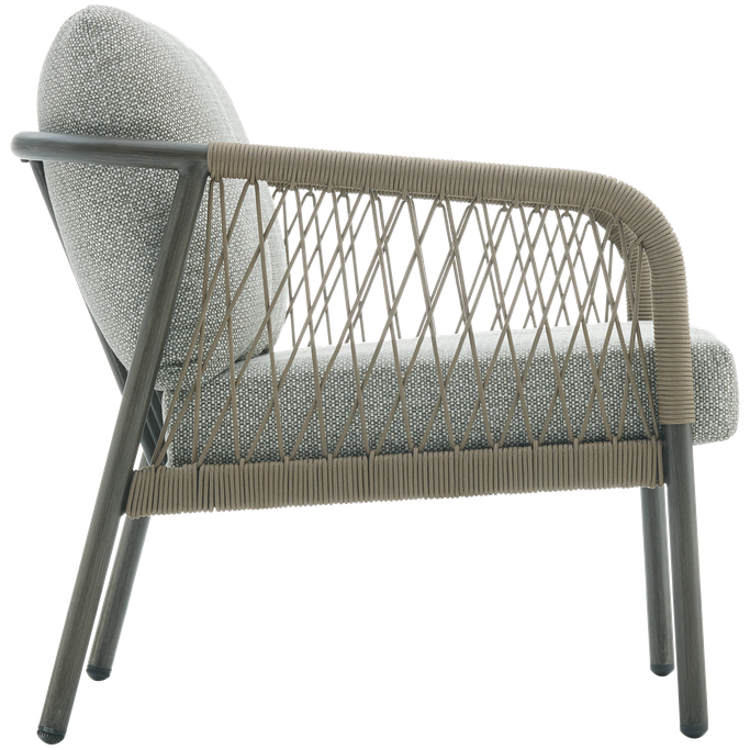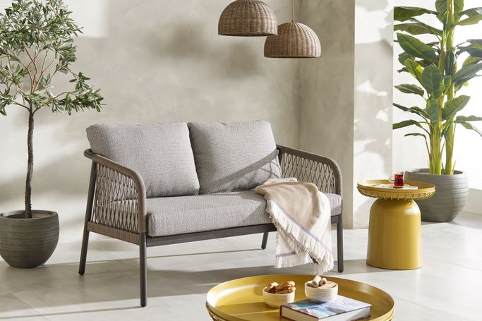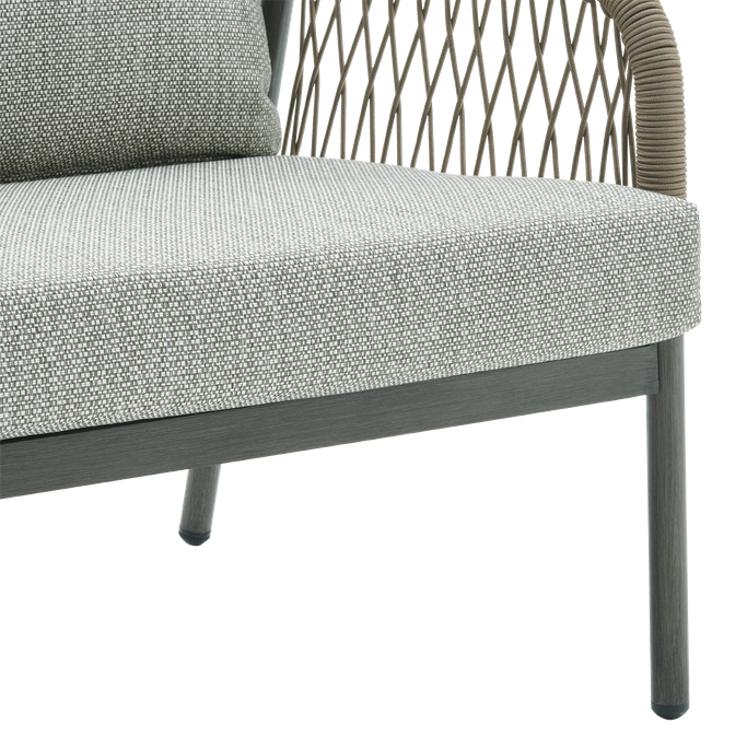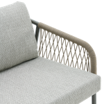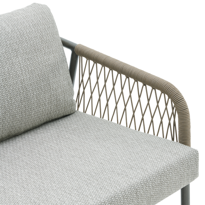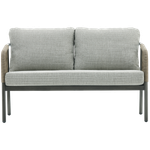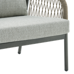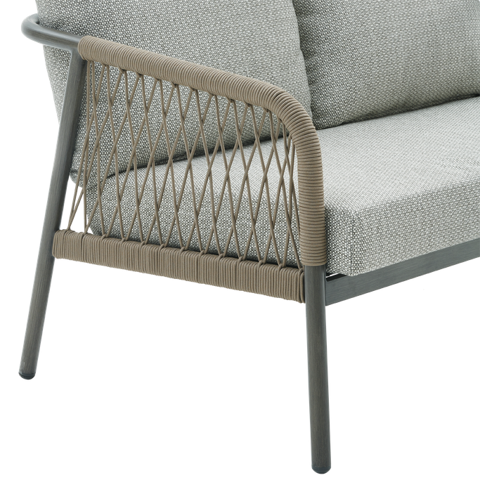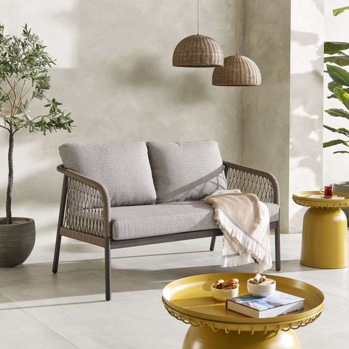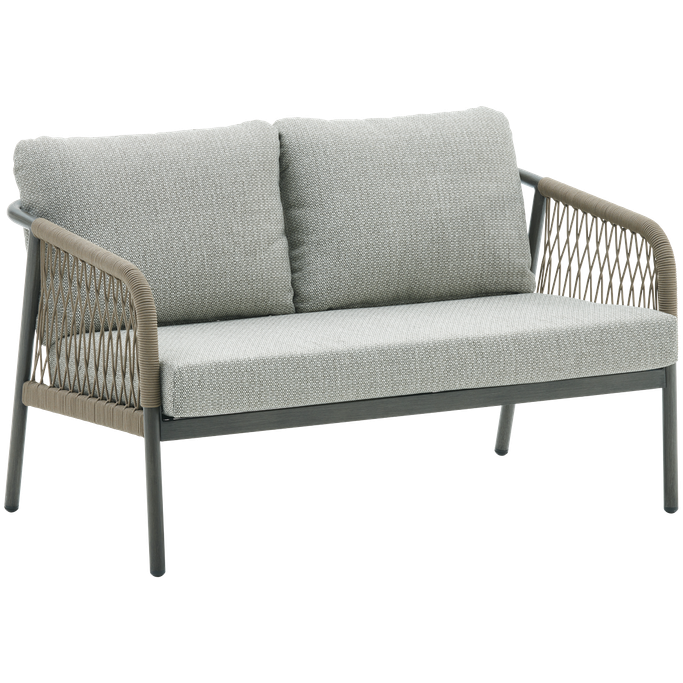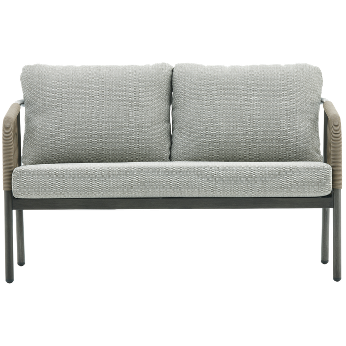 Elegance in the open air—enjoy relaxing moments with the Fame 2-Seat Sofa. Designed with soft, flowing lines and curved arms adorned with interwoven fabric that adds a unique artistic touch, along with comfortable seat cushions. It is made from durable aluminum and olefin fabric in a calming grey tone, perfectly complementing any outdoor decor. Cherish special moments that fill your heart with joy in your garden.