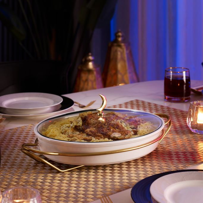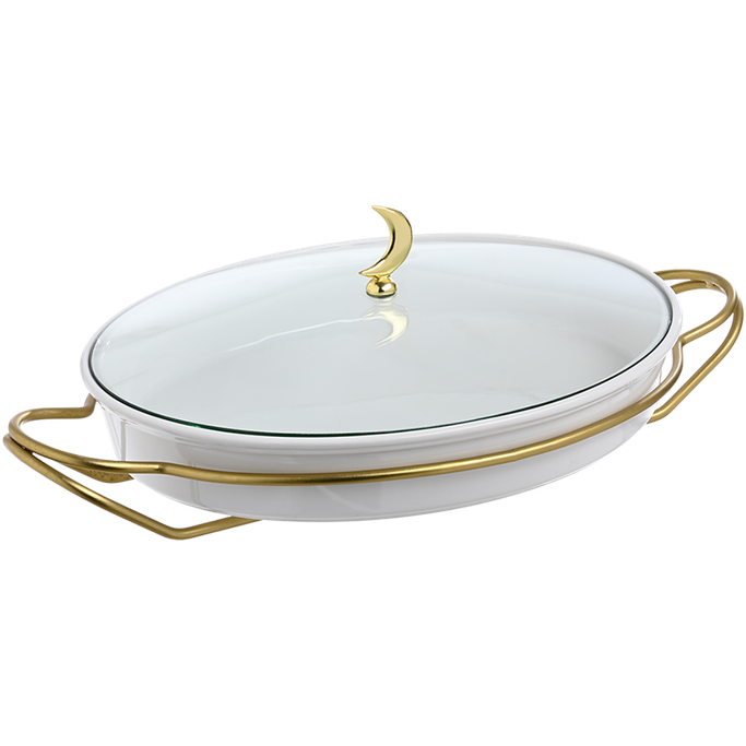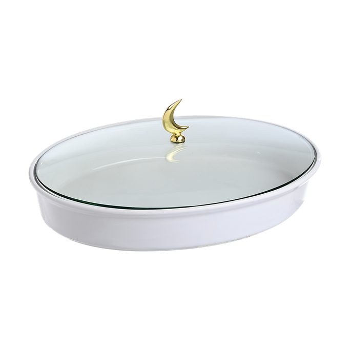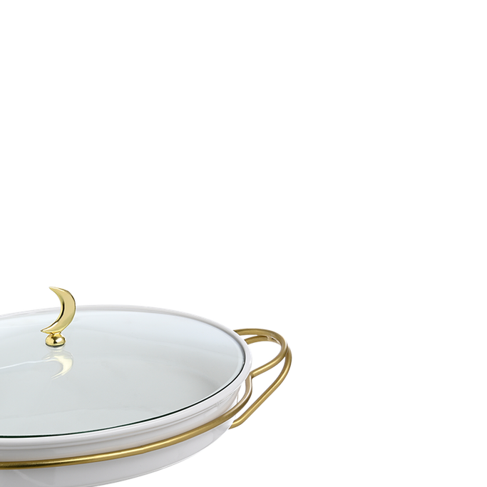 Enrich Every Moment. Make your table shine under the moonlight with Ghasaq Serving Dishwht. Create an elegant atmosphere while serving your food in style. the moon shaped detail will emit a pleasant aura to rejuvenate your soul and surroundings. Designed in a circle shape, with golden handles to perfectly fit your needs. It's made of glass and metal with white and golden shades to set your table on sparks with its luster. Dine with the moon to enrich your moments.