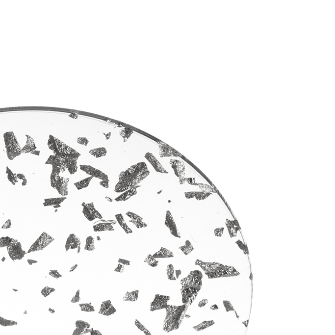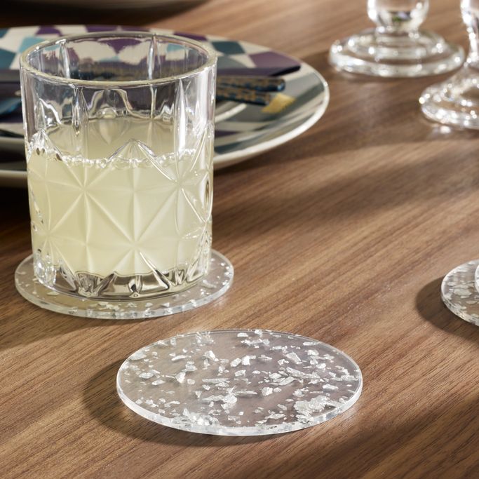 Among the Shimmering Ambiance. Your cup will shine brightly with Hayley Coaster Set. Your space will be glammed up to feel radiant bliss from every piece. The pattern exhibits a luscious beauty of golden hues that captivates all who view it. Designed to protect your table from heat and decorate your cups. It is made of clear acrylic with silver color to make your home glisten. Enjoy a drink amid opulence.