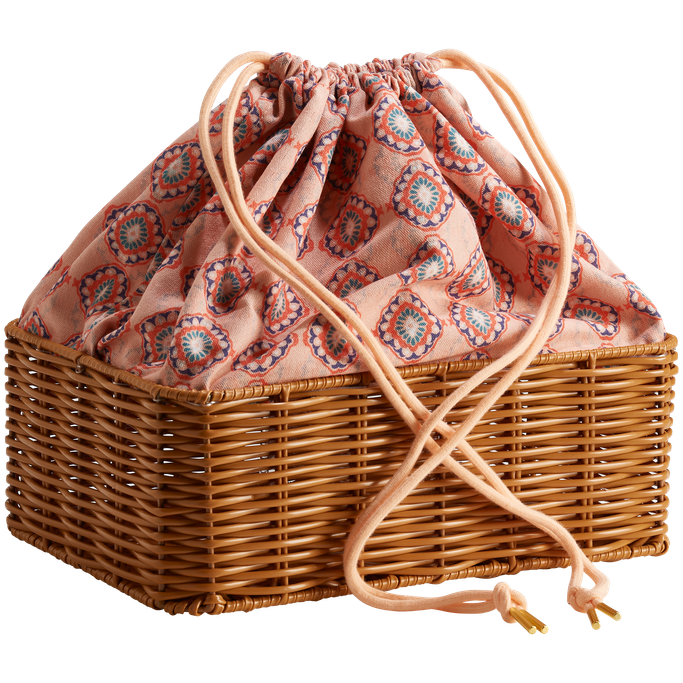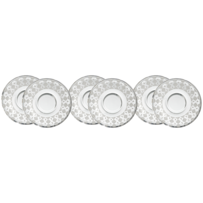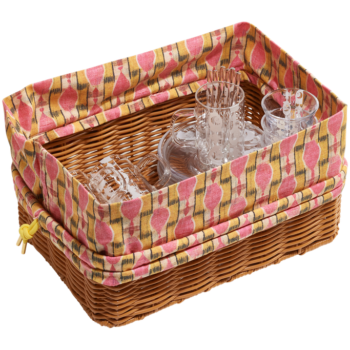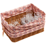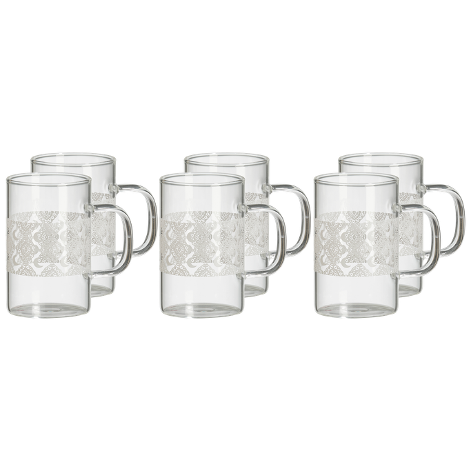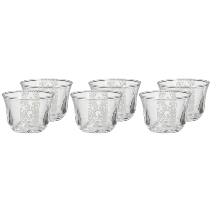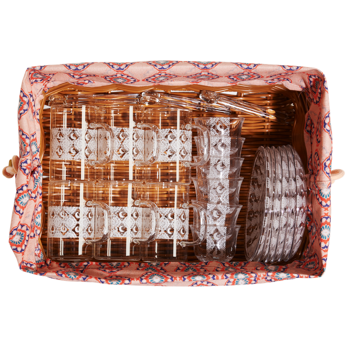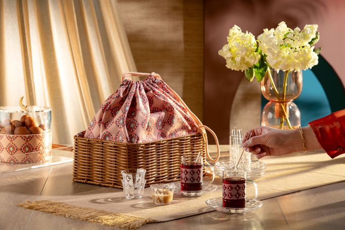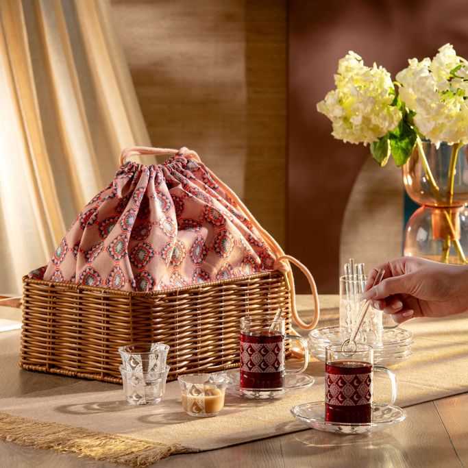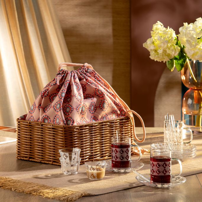 Celebrate warm Ramadan nights with Ziana Ramadan Set. Designed as nineteen pieces including Arabic coffee cups, tea cups, serving saucers, and small spoons, adorned with delicate Ramadan patterns, along with a woven basket featuring a patterned fabric lining with vibrant motifs and a drawstring closure to store and transport contents safely and elegantly. The set is made from Clear Glass and the basket from Fabric in Brown and Yellow colors. Give it as a perfect gift to your loved ones.